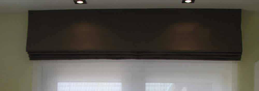 Ein Raffrollo aus einem transparenten weißen Stoff. Dieses Rolllo kann man auf und zu machen. Darüber wird ein weiteres feststehendes Faltrollo montiert, mit einem schönen dunklen Stoff. Dieses Rollo ist feststehen.