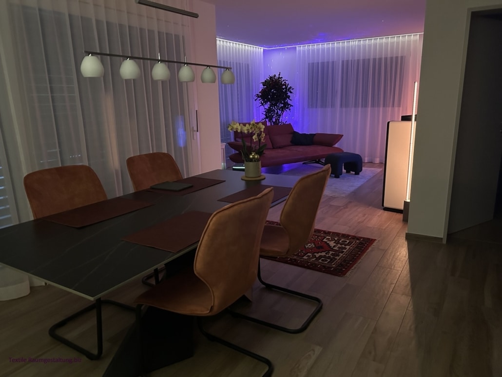 - Esszimmer: Der Stoff sorgt für Helligkeit am Tag und eine angenehme Atmosphäre am Abend – besonders in Kombination mit blickdichten Vorhängen.
