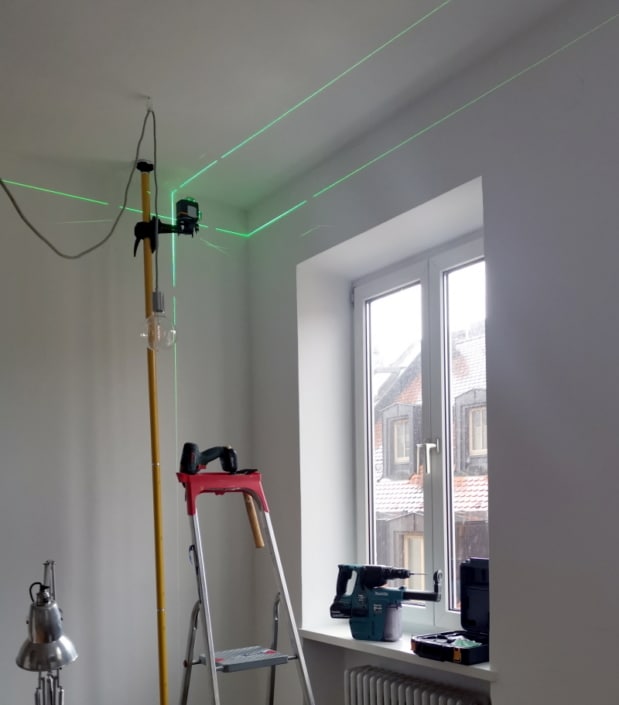Raffrollos sollen exakt waagrecht montiert werden. Das ist in einer Altbauwohnung auch nicht ganz einfach. Dazu verwende wir einen Baulaser. Das vereinfacht die Arbeit enorm und macht Spaß und geht „ruck zuck“.