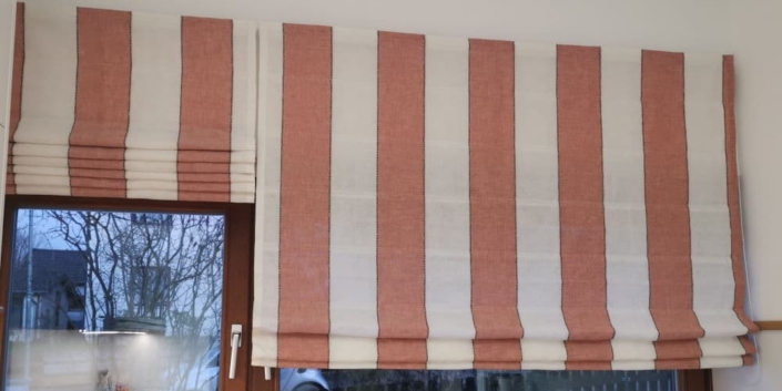 Raffrollos oder Faltrollos oder Roman Blinds ist eine moderne Fensterdekoration. Hier können Sie unterschiedliche Formen sehen. Normale Faltrollos, Doppelfaltrollos und Faltrollo-Attrappen. Mit unterschiedlichen Stoffen und Designs.